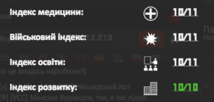 Індекс розвитку - впливає на зарплатню лідерів, міністрів і губернаторів автономій. Визначає чи можливий в регіоні Бунт.