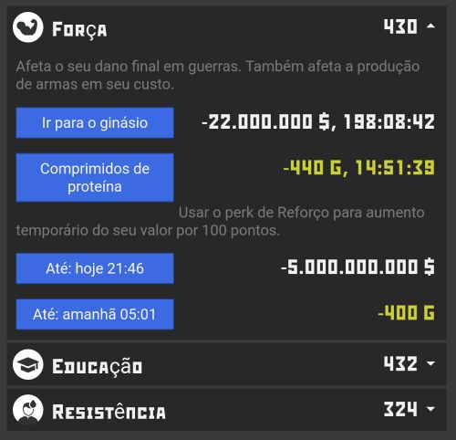 Existem três Habilidades: Força, Educação e Resistência. Todos os jogadores começam com vantagens iguais a 30. Aprender novas vantagens leva tempo. Para aprender novos benefícios, você deve escolher um dos dois métodos: você pode usar ouro e aprender benefícios mais rápido ou gastar seu dinheiro e aprender benefícios lentamente. Você pode aprender apenas uma vantagem de cada vez.