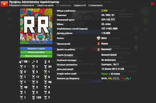 Профіль Адміністратора і його медалі